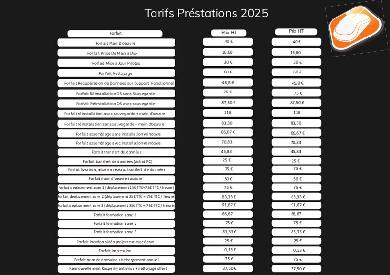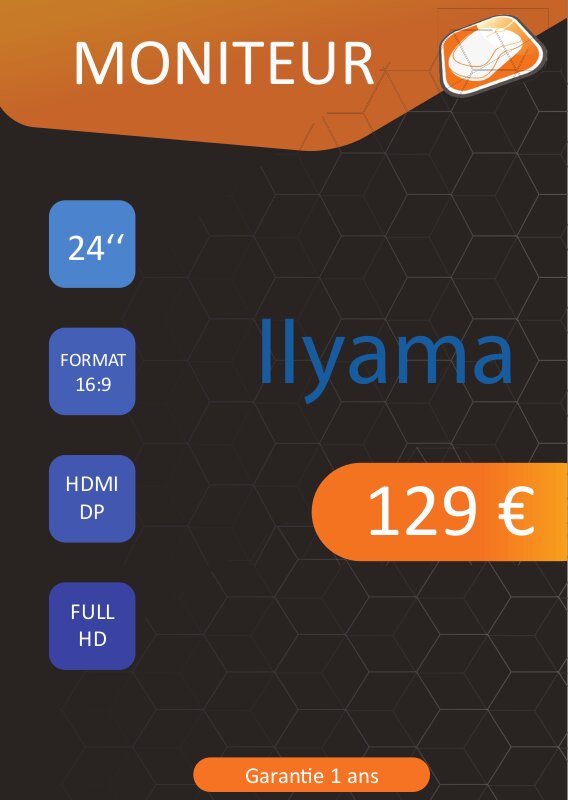 Mon rôle dans cette entreprise est de m'occuper de tout ce qui est la partie graphisme et communication visuel. C'est-à-dire que je vais devoir m'occuper de recommencer leur design de leurs carte de visite mais également leurs panneau d'affichage, leurs étiquettes de prix (au format A6 sur lesquels il y est affiche la marque de l'article, son rôle, la taille, son format, HDMI ou pas, ainsi que la qualité de l'écran), leurs affiches de tarifs sur lesquels ou est affiché leurs tarifs pour tous leurs services client comme par exemple (leurs déplacement pour aller chez leurs client pour une installation, le forfait de main d'oeuvre a distance ou en présentiel, etc...)