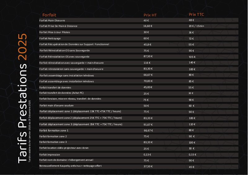 Dans cette deuxième semaine de stage à A2DF informatique j'ai du faire quelque petite modification concernant le tableau des tarifs de l'entreprise, j'ai simplement du rajouter des liserais en forme décagones.Ensuite j'ai du commencer à faire des bannières pour chaque personnes de l'entreprise pour les bannières de mail.Je devais faire une bannière pour chaque période de l'année commeune bannière classique, l'hiver, l'automne, l'été, le printemps ainsi que Noël et Halloween.